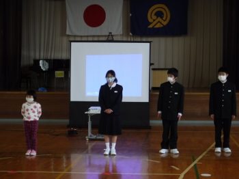 次の写真は、朝と昼の全校集会の様子です。新入生や転校生が、全校の前で自己紹介やあいさつを元気よく行いました。集会の最後は、全校児童生徒の記念撮影を行いました。