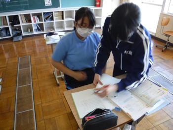 中学生の授業の様子です。左の写真は、生徒がリトルティーチャー役となって、友だちの学習の見ている場面です。一番下の写真は、理科の授業で学習のまとめを行っている様子です。