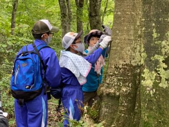 2日目、小学1年から4年生は、胎内市の奥胎内ブナ林散策で体験活動です。そして、ネイチャークラフトにも挑戦です。
