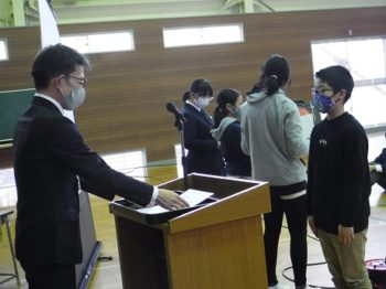 終業式の前に、賞状の伝達式も行いました。人権作文、人権標語、県ジュニア美術展等に入選したものです。