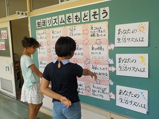 こちらは昼休みの様子です。体育館では児童・生徒と職員が一緒になって「こおり鬼」をしていました。ステージでピアノを弾いたり、教室で体育祭の練習をしたりする生徒もいました。最後の写真は、保健室前の掲示物「生活リズムをもどそう」で、今の自分の生活リズムを確認している児童の様子です。