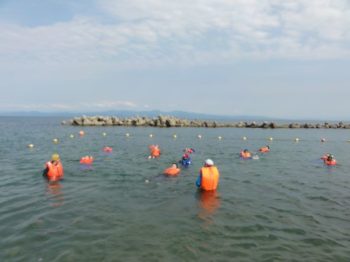 中学生は、午後から水泳授業を行いました。今年度の努力を検証する水泳検定を行ったり、遠泳で長い距離を泳ぐトレーニングを行ったりしました。最後は、いざという時のために、脱力をして水面に浮く練習を行いました。その練習に加えて今度は救命胴衣を着用して浮いてみることで救命胴衣の大切さを学ぶことができました。練習の最後には、今まで自分たちを鍛えてくれた粟島の海に感謝の気持ちを込めて一礼し、今年度の水泳授業は幕を閉じました。