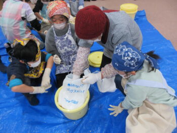 この活動は2年に1回行っており、子どもたちが作った味噌が次の年の親子わっぱ煮会で、使用される予定です。